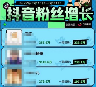 仅在8月15日—8月21日单周,富贵就涨粉233.9万,涨粉率高达90.7%。超过疯狂小杨哥的230.1万,涨粉数量排在抖音博主第一位,妥妥成为顶流。