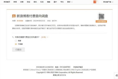 同时,新浪博客还发布了一项付费意向调查,官方称博客存量博文数据较大,全部放开需要较长时间,您是否需要付费申请优先放开博文?博文放开后可长期展示(违法违规的除外)。结尾给了用户需要和不需要两个必选项。