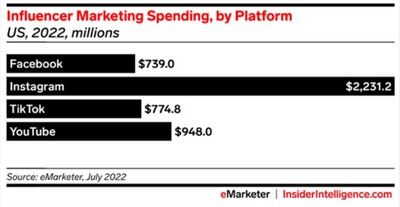 InsiderIntelligence 的数据预测,2022年营销人员在 TikTok 上的网红营销支出将会超过 Facebook,但是可能多数的支出都投入在了商业价值更高的头部创作者