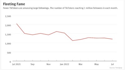 根据 trendpop 的一份最新数据显示,自2021年7月以来,TikTok 平台上拥有超过100万粉丝的创作者数量开始下滑,而到了今年年初更是出现了一次大幅度的滑坡。数据表明,自去年以来 TikTok 上百万粉丝体量的创作者数量的降幅达到41%。具体来看,粉丝量达到百万的 TikToker 在2021年7月达到2000名左右,而到了2022年7月降至大约1200-1300人之间,流失了接近800人。