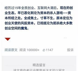 现在的创业生态,早已恶化到沦为资本的杀人游戏——资本所经之处,全成焦土,寸草不生,原本定位为创业天使的风投资本,已彻底沦为扼杀绝大多数创业空间的魔鬼。