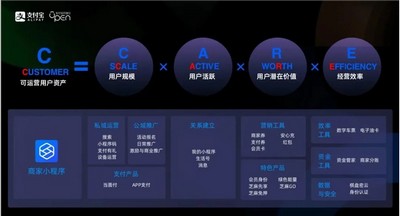 以支付宝为例,在今年7月的合作伙伴大会上,它推出了商家数字化自运营模型C-CARE。其中,第一个C指的是用户价值,后四个字母分别指代用户规模、用户活跃度、用户潜在价值和商家经营效率。支付宝认为,四大因素共同决定了用户价值。