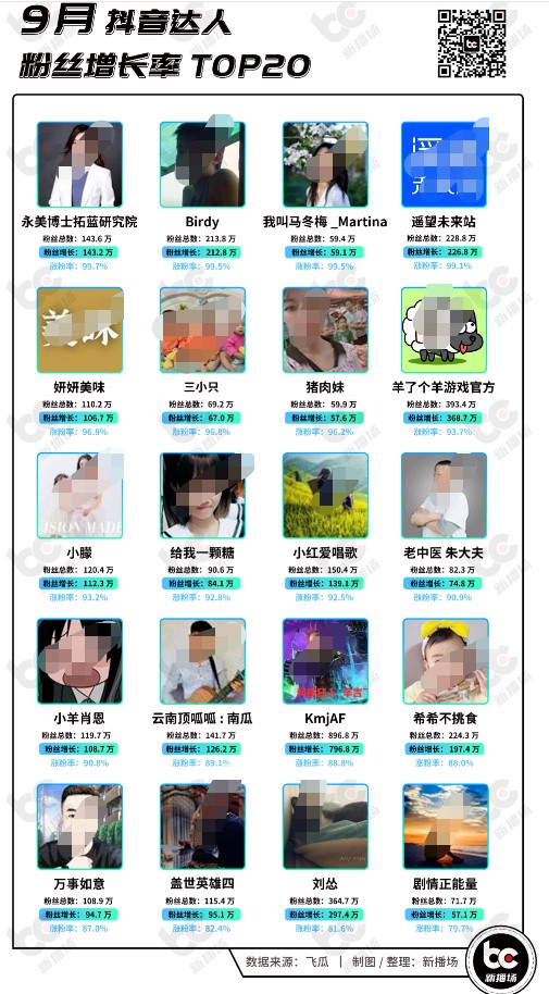 在涨粉榜单、涨粉账号类型、粉丝增量区间外,新播场还统计了9月涨粉Top200的涨粉率。