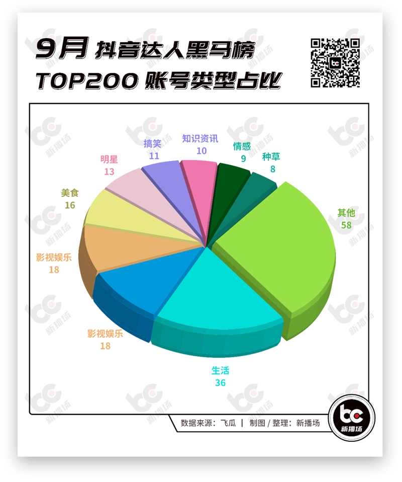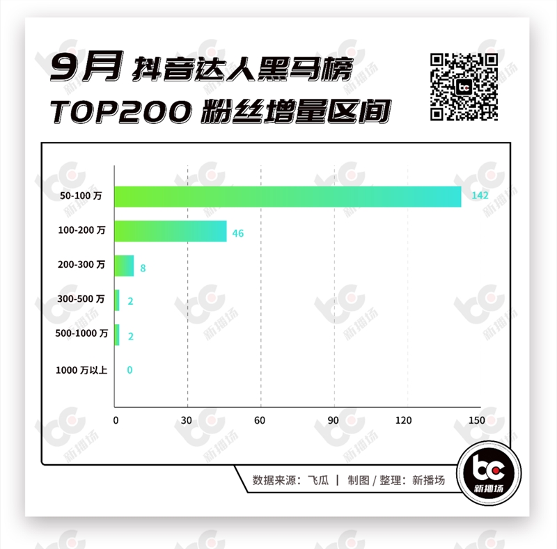 除了涨粉榜单外,新播场还对抖音9月涨粉Top200的达人类型和涨粉区间进行了统计。