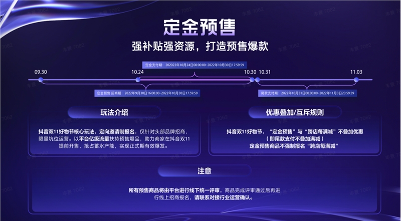 「定金预售」玩法今年有了更多支持,平台将针对头部品牌定向招商,参与活动的商家商品将享受到抖音商城、搜索场、短视频及直播等全域展示,更有平台货品补贴与宣发资源。