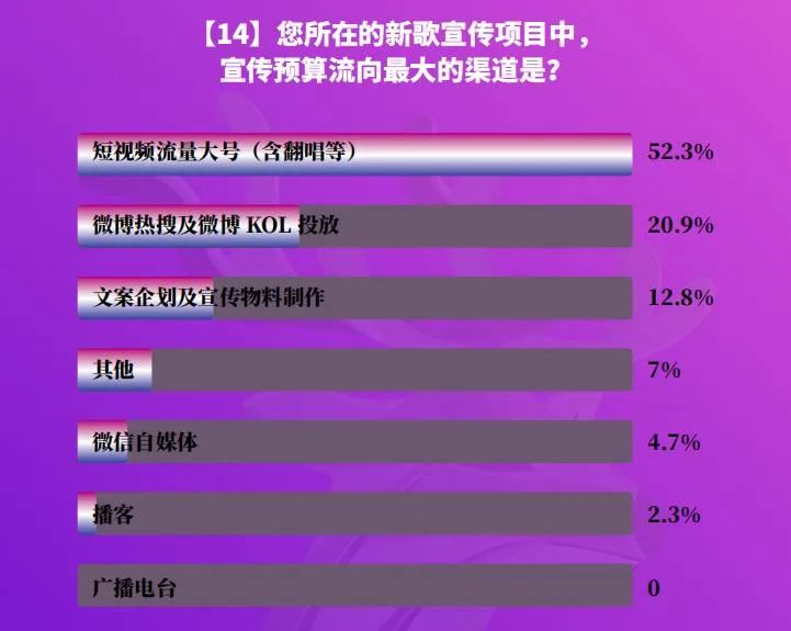 “我靠做营销号渠道,现在月入十万,只花了一年多的时间。”包永千在采访中表示。2021年发布的《中国音乐营销发展研究报告》也显示,从业者认为短视频流量大号(含翻唱等)是音乐宣传预算流向最大的渠道,占比高达52.3%。
