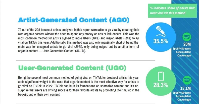 研究发现,AGC(Artist-Generated Content,艺术家生产内容)是2022年音乐营销最常见的成功策略,208位音乐人中有74位通过AGC在TikTok上完成音乐作品的病毒传播,占比达35.5%;UGC(User-Generated Content,用户生产内容)位居其次,占比达28.3%,大量普通用户通过在自己的视频中使用歌曲作为BGM,实现了音乐的自发推广。