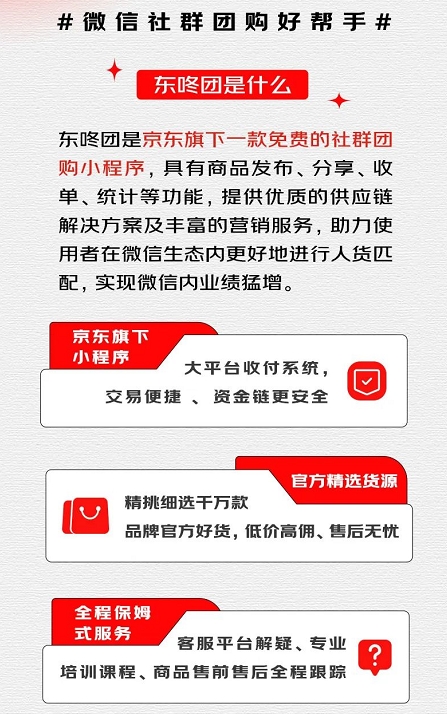 根据官方介绍,东咚团为京东旗下社群团购小程序。具有商品发布、分享、收单、统计等免费功能,致力于提供优质的社群团购体验。