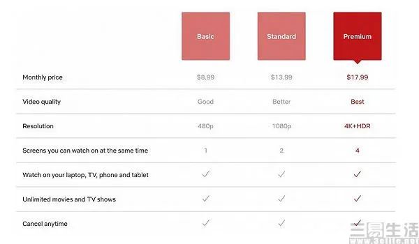 在价格上,6.99美元/月的定价几乎堪称是毫无性价比。因为即使Netflix在今年年初将全部订阅服务又双叒叕一次涨价,但其基础版订阅服务也不过是涨到了9.99美元/每月,标准订阅计划则从每月13.99美元上升至15.49美元,而高级订阅计划从每月17.99美元上升到了19.99美元。换而言之,含有广告的这一套餐仅仅只比基础版会员每月便宜了3美元,画质从480P升级到720P。