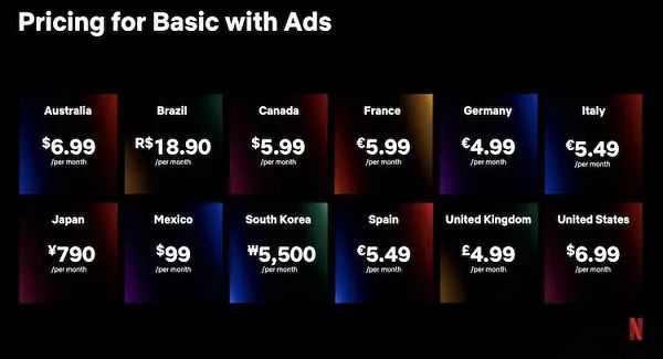 在经过了数月的准备以及在微软的技术支持下,Netflix方面在10月14日公布了即将推出的含广告套餐(Basic with ads)相关信息。据悉,这一套餐在美国市场的价格为6.99美元/月,将于当地时间11月3日上线,并会在澳大利亚、巴西、加拿大、法国、德国、意大利、日本、韩国、墨西哥、西班牙、英国同步推出。