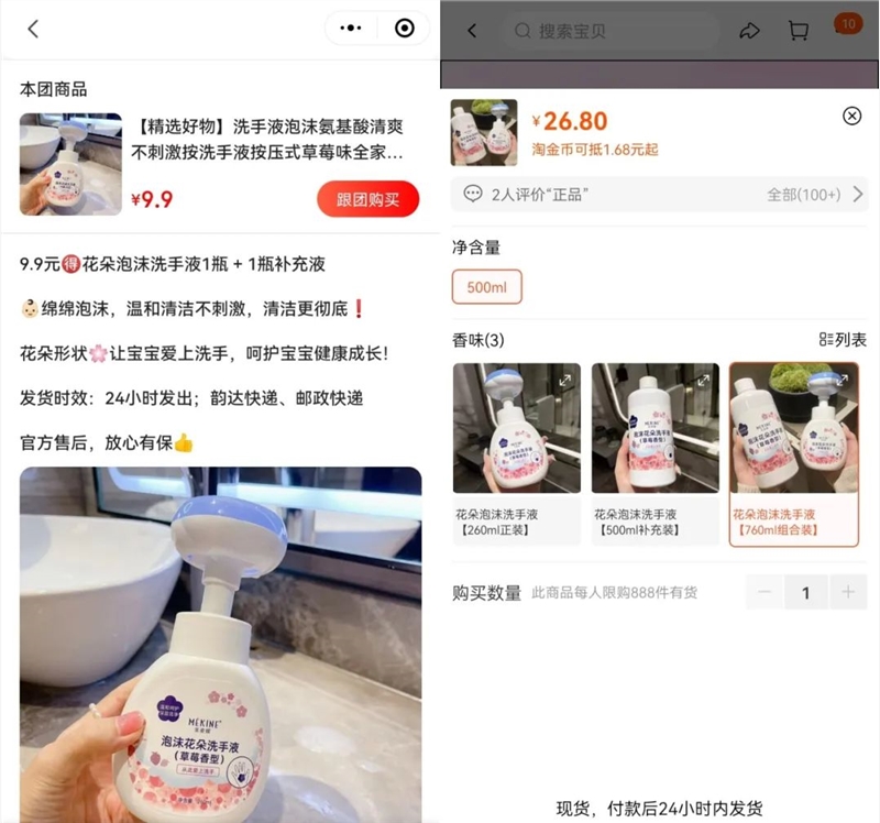虽然标榜“比京东更便宜”,但并不一定比其他平台便宜。东咚团上,泡沫花朵洗手液和补充装的价格在9.9元,同款商品在京东平台上售价为35.8元,淘宝售价为26.8元,拼多多售价为21.4元,确实是全网最低价。但东咚团中团购的泉阳泉矿泉水价格在57.6元,相同规格的商品在淘宝上只需要44元。