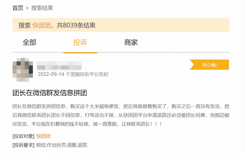 独立运营的快团团,整个小程序的开发会更加具有独立性和针对性,那就是“工具属性”,快团团不需要去考虑基于拼多多的内容稳定性。但快团团的负面影响也不可忽视:低准入门槛会造成货源问题,团购也是完全依赖团长信誉度进行,平台没有账期,也不担保交易,售后和履约是最大问题。在“黑猫投诉”上,关于“快团团”的投诉达8000多条,不少是团长不发货和收到虚假产品。