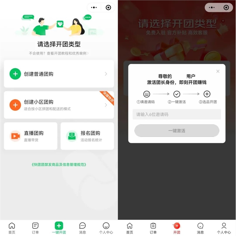 有团长告诉「电商在线」,东咚团平台内的团长还不多,与快团团“0门槛发起团购”不同的是,目前只有获得定向邀请或者邀请码的团长才能发起团购。一些服务商表示可以提供邀请码开通团长权限,但需要通过审核,“最好是有做快团团、群接龙这些团购经验的,或者有自己流量的。”