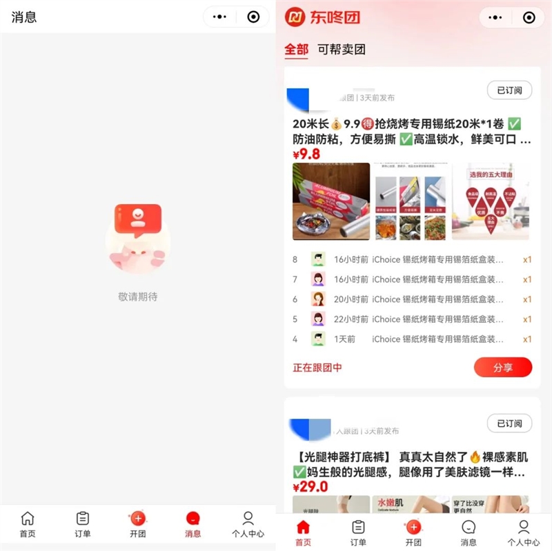 相比于有着小程序、京喜APP入口的京喜拼拼,还在内测的东咚团更加低调,只悄悄上线了微信小程序,并且主打社群团购——预售模式,微信社群裂变,依赖团长信用背书将有相同购物需求的消费者汇聚起来,团购品类也会更加繁多。