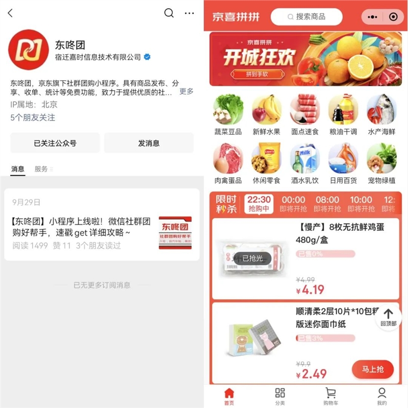 消息最开始在各个团购团长之间流传。一位团购团长表示,她在9月25日左右就听其他团长说了“东咚团”的社群团购小程序,对标快团团,正在定向邀请团长。彼时,京东官方还未确认消息,直到9月29日,“东咚团”的微信公众号才正式公布了这个社群团购小程序。