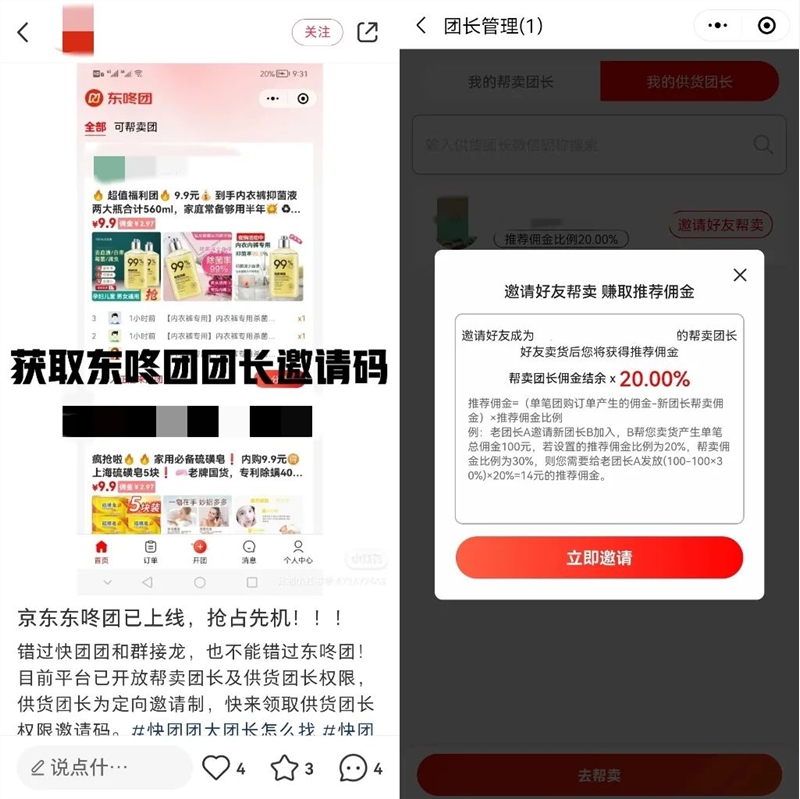 在小红书、抖音和微信公众号上,已经出现了一些招募东咚团团长和帮卖的内容,基本不要求经验,也没有人数限制,一位团长表示他现在已经有了120多位帮卖,并且还在招募中。