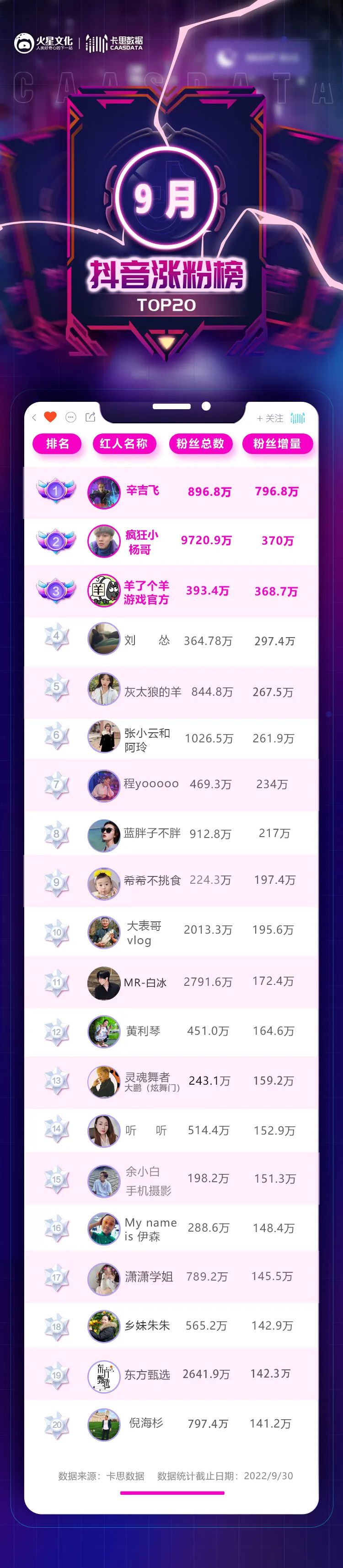 放眼望去,相较8月而言,9月涨粉榜的整体走势稍显低迷:位列榜首的“绝命毒师”@辛吉飞虽在9月强势吸粉796.8W,并成功让“科技与狠活”席卷了整个平台,但该账号已于9月21日自行注销,目前已查无此号。@辛吉飞之后,已连续三个月登上涨粉榜前三甲的@疯狂小杨哥,这次又以310W的粉丝增量成为榜单TOP2。截至发稿前,其粉丝量已达到9904.5W,,距离突破1亿大关似乎只有一步之遥。