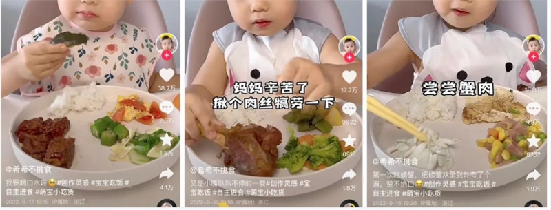 据观测,@希希不挑食的第一条作品发布于2021年8月20日,彼时的希希在吃饭时虽然还没有那么讲究,却已然能从其大快朵颐的模样中看出小吃货的影子。而在妈妈的耐心引导下,希希吃饭开始日益讲究。