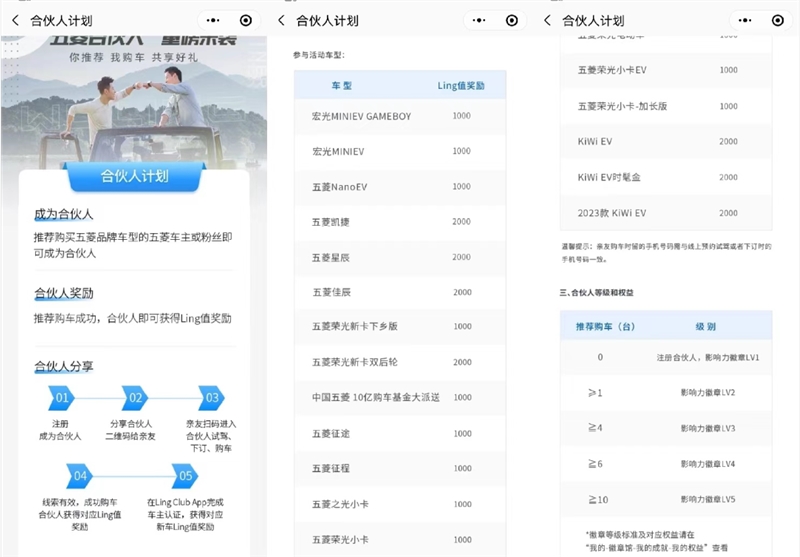 例如合伙人计划,推荐购买五菱车型的五菱车主或粉丝即可成为合伙人。成功推荐购车的合伙人可以获得大量Ling值奖励。