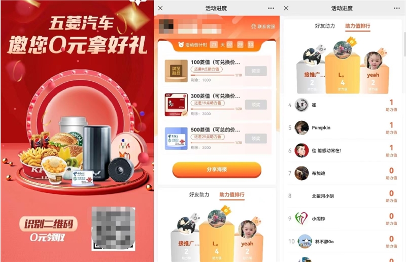 另外,在「0元拿好礼」活动中,用户通过邀请好友获得助力值,邀请越多好友,获得越多的奖励。如,邀请10人参加活动,获取100个菱值,可兑换价值10元礼品。
