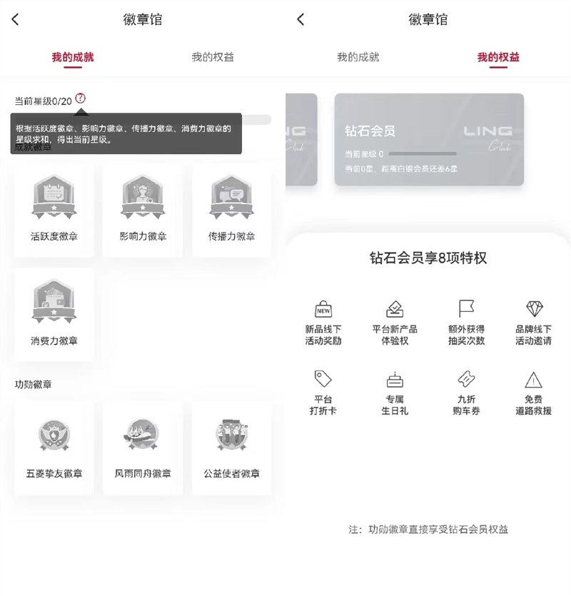 徽章体系是面向APP中的车主,通过计算用户的活跃度、影响力和传播力的星级,来实现用户会员等级升级,激励车主更多的参与社区活动。