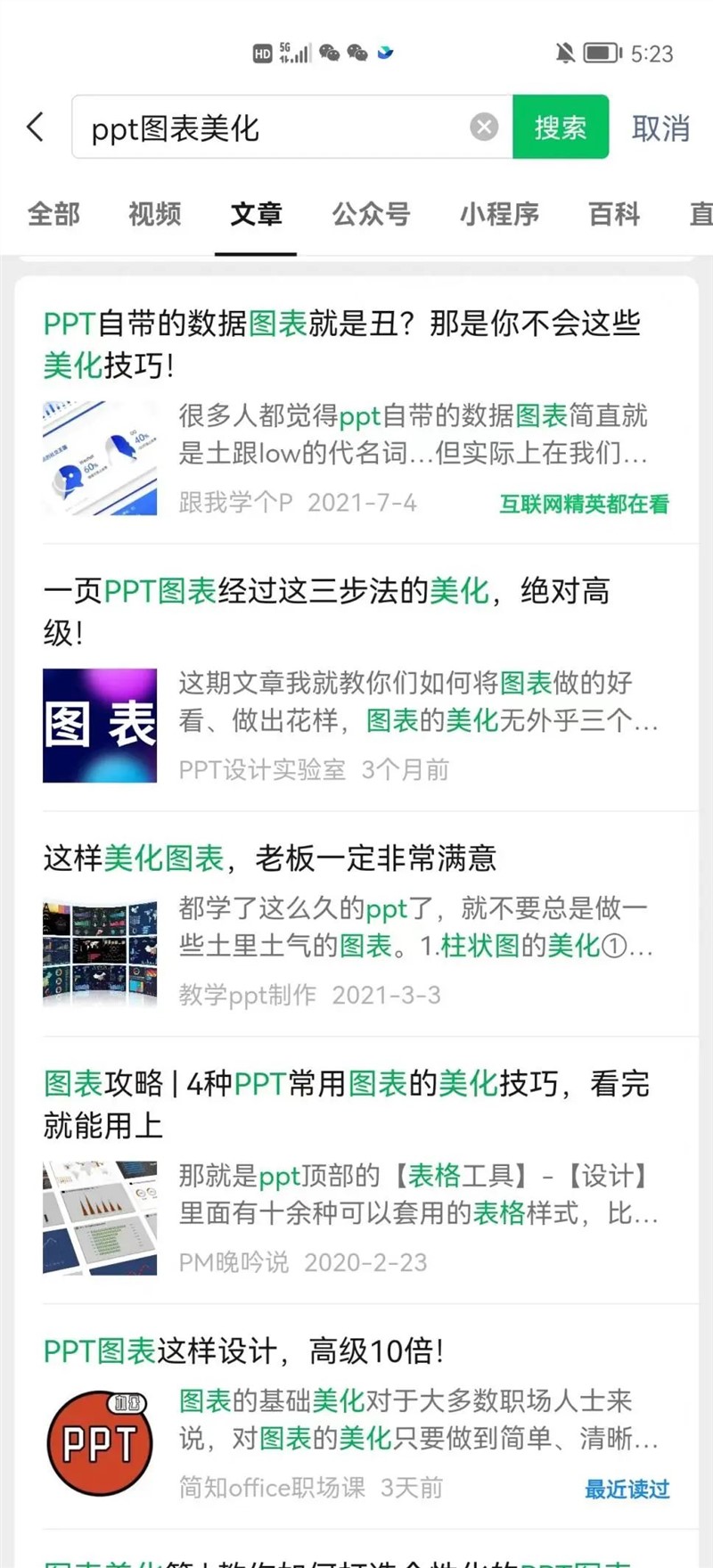 比如我们用关键词“PPT图表美化”搜索,结果如下