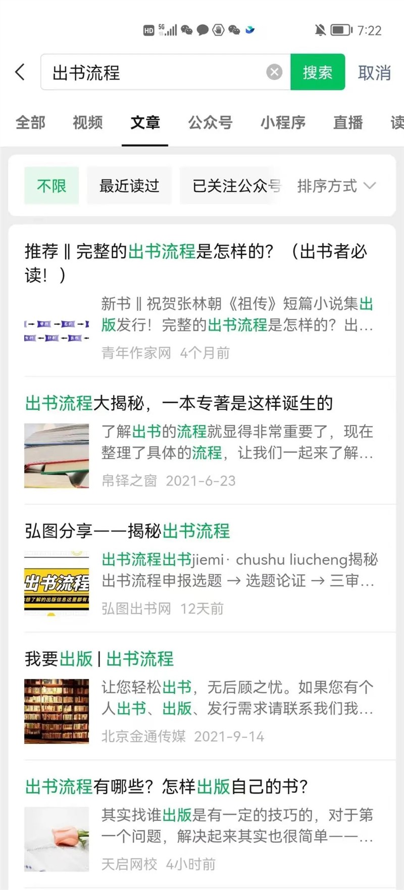 但出书也是一个很小众的关键词,真正搜索这个关键词的人都是精准目标意向客户,他们也许会在微信里搜索关键词“出书流程”,“出书流程及费用”