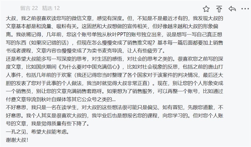 我有个粉丝给我留言,说我过去写文章比较独立,现在每一篇文章都是讲如何做新媒体账户,讲流量运营的方法,每篇文章结尾还都带了图书或课程广告,让人审美疲劳了。