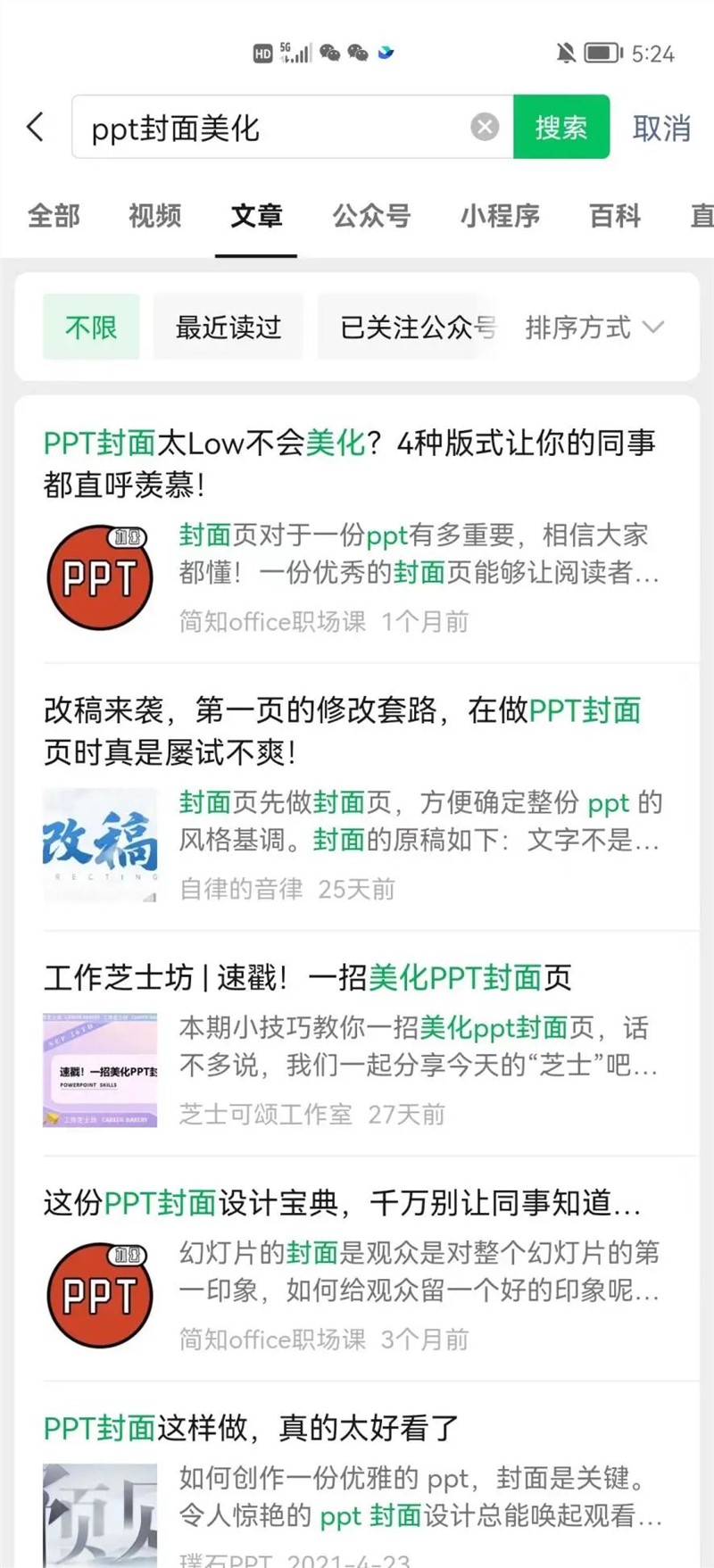 比如我在微信里搜“PPT”,到文章页面,会出现不同的结果,我把两页结果都截屏给大家看。