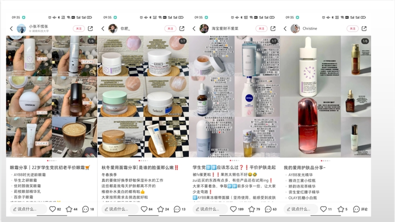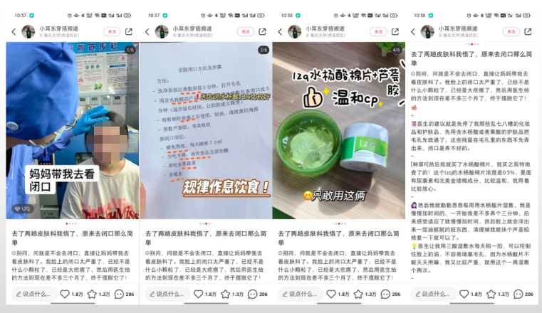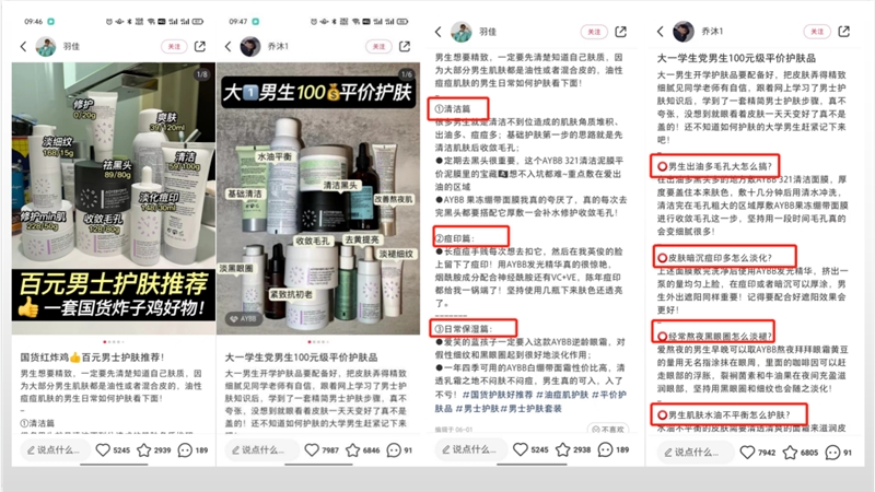 追踪了AYBB品牌在小红书上的几条爆文内容,首先品牌官方账号爆文的内容形式是以自家产品进行组合推广的,针对的人群是00后,油痘肌