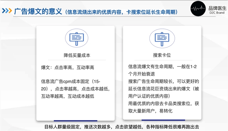 首先了解广告爆文的意义是降低买量成本以及进行后续的搜索卡位,想要降低买量成本,那么内容的点击率和互动率就很重要,所以对产品在小红书上的发文内容的要求也就要有所提高。