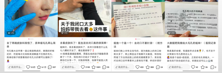 跟踪了几条爆文笔记的内容,首先爆文的内容标题基本为“去了皮肤科我悟了,原来缩毛孔,去黑头那么简单”,通过皮肤科这个特殊的环境,给用户带来的可靠性,带来了不少的搜索量