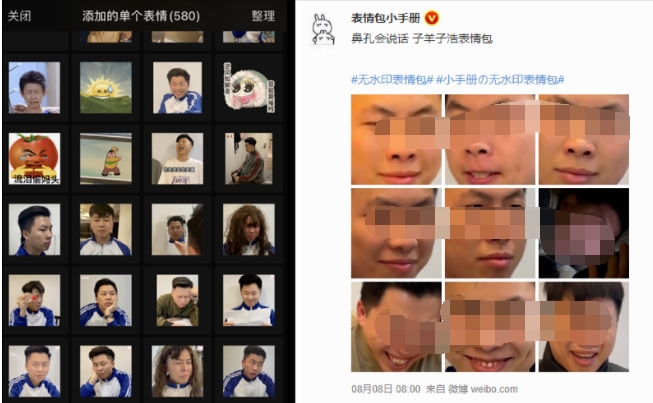 除了优质的作品内容之外,通过表情包实现破圈是子羊子浩得以走红的另一个原因。子羊子浩是网友公认的“沙雕表情包大户”,尤其是他们的“憋笑表情包”,在一些工作群和搞笑视频中广为流传。