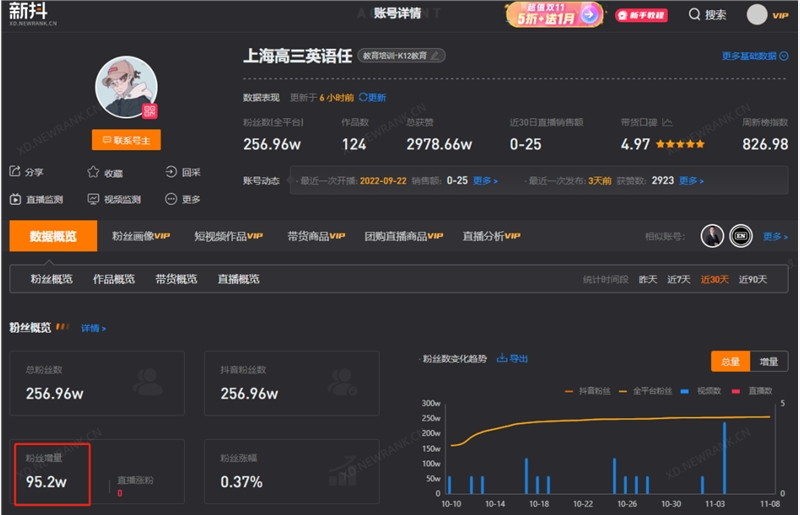 新抖数据显示,在10月10日发布音标“教学”视频后,“上海高三英语任”(下文简称任老师)不到一个月抖音涨粉95万,截至发稿前,这个今年才开始有认真经营痕迹的抖音账号,目前粉丝超过256万。