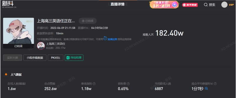 新抖数据显示,这是“上海高三英语任”被监测到的首场直播,观看人次就超过了182万,单场直播涨粉1.18万。