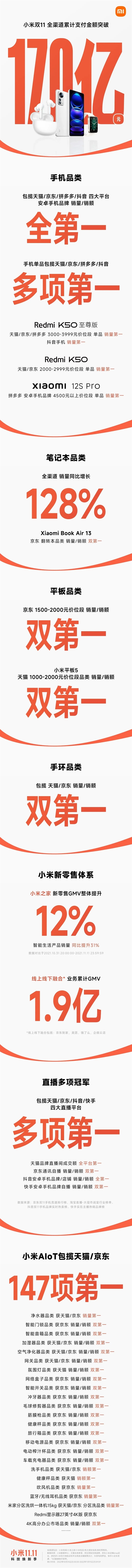 今日凌晨,小米创办人雷军公布了双11战报:小米双11全渠道累计支付金额突破170亿元。