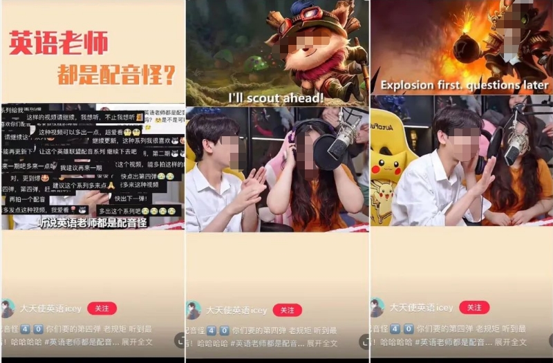 然后迅速地进入“才艺展示”阶段,选择了几位在年轻人群体中热度很高的游戏角色进行配音。这一安排一来更贴合短视频受众,二来这两个月一直是《英雄联盟》S系列赛的比赛期,大众对其的关注度和讨论度都非比寻常。