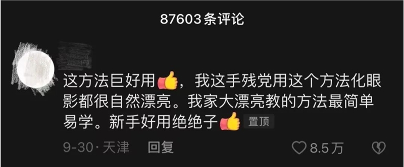 这条视频发布后,获赞182.7W,收藏量高达76.4W,更是为其带来了近54万的粉丝增量,一个用户在评论中表示“手残党用这个方法化眼影都很自然漂亮”,获得了8.4W点赞。
