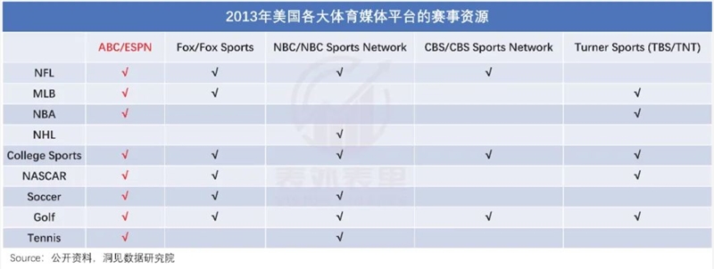 一方面,ESPN和大多数平台一样,发挥资本的力量不断包揽上游内容&版权资源。如下图,2013年美国各大体育媒体平台的赛事资源,ESPN是最全的。