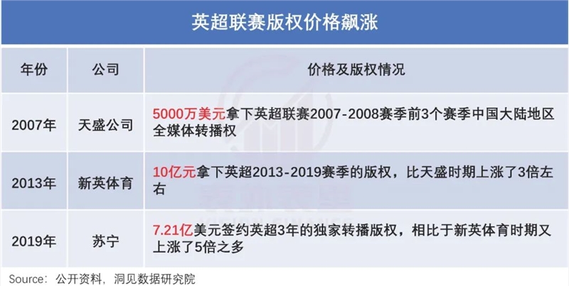 可以看到,英超联赛版权价格连年翻倍,腾讯、PP体育、乐视都曾为买联赛独家版权大出血。