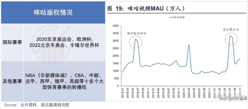 咪咕视频也是一样的情况,去年东京奥运会期间,凭借直播权优势,月活跃用户3600万,环比增长14.5%。