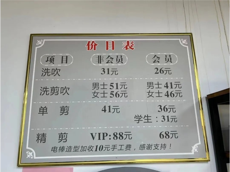 会员女士一次洗剪吹的价格从36元上涨至46元,男士从31元上涨至41元。而烫发卷发的价格具体没有价目表,全靠tony们一张嘴说。据店里员工表示,烫发卷发大概上涨了50元,但目前平均价格控制在300多元。
