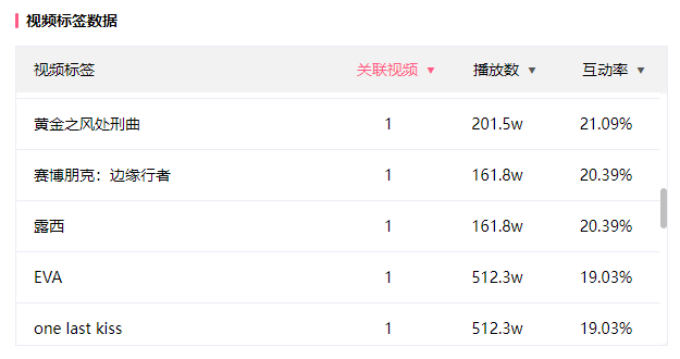 在瑶生的视频标签数据中可以看到,他的花手摇摇的都是二次元、潮流影视作品的BGM。