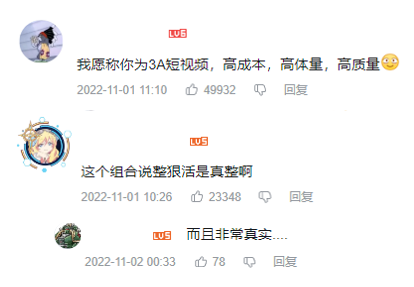 观众对作品制作的感叹全部体现在评论区中,对UP主们的评价清一色是“高成本、高体量、高质量的3A大作”、“真·狠活”等高度认可。