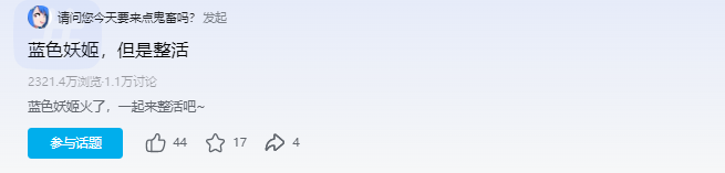 还有近期从短视频平台流行起来的“蓝色妖姬” ,在B站也同样受到了关注,就连官方都发起相关话题“#蓝色妖姬,但是整活”来刺激UP主们二创,话题浏览量截至目前已经高达2321万。