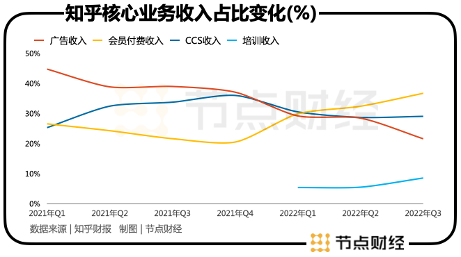 而知乎传统的核心业务广告收入占比本季度已下滑至21.6%,较2021年年初的45%下滑超过23个百分点,这意味着广告业务不再是知乎的核心支柱。