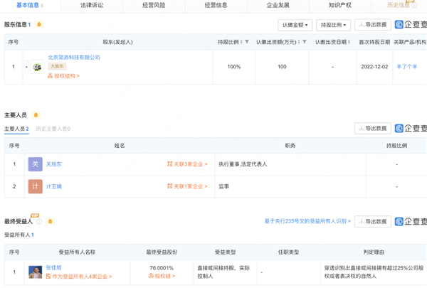 据悉,该公司由《羊了个羊》开发商北京简游科技有限公司全资持股,实控人、最终受益人为张佳旭。