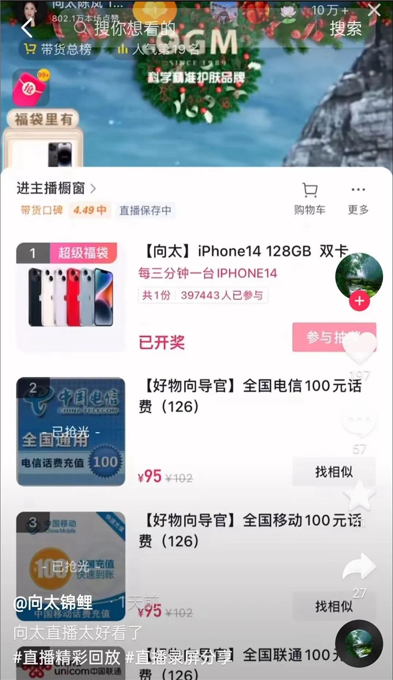 直播刚开始,向太便拿出了真金白银的福利造势,一分钟送出一台iPhone手机,还时不时随机抽取几位幸运观众送福利。