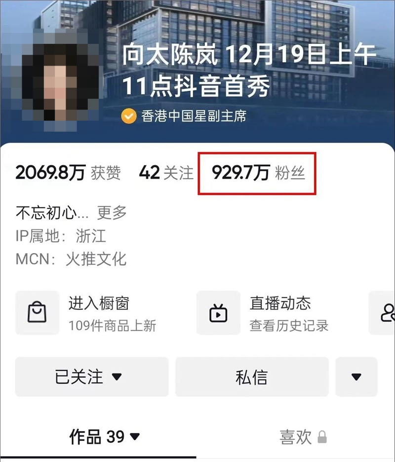 12月19日中午11点,“港圈大佬”@向太陈岚 在抖音开启了直播首秀,5分钟直播间观看人数突破25万,3小时销售额破亿,当日最终销售额累计超3亿、涨粉上百万。