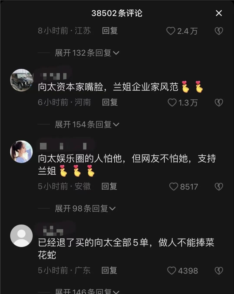 在张兰的视频评论区,也有网友留言“向太的货,我已经退款了”、“已经退了买的向太全部5单”......